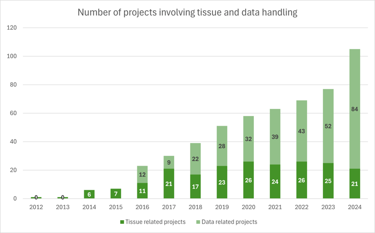 Die TBB leistet einen aktiven Beitrag für die Forschung, dies zeigt die steigenden Zahlen von prospektiven und retrospektiven Projekten sowie kundenspezifischen Sammlungen. Die Zunahme der Projekte ist in der nachstehenden Abbildung dargestellt.